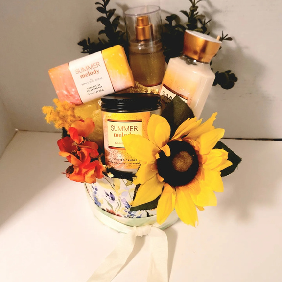 Summer Melody Candle, lotion, bar soap and body mist, yellow Loofa scubber