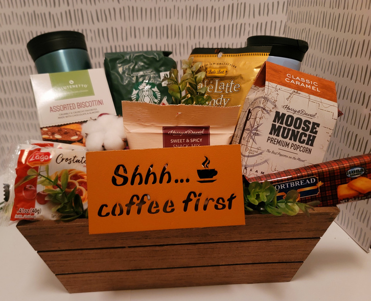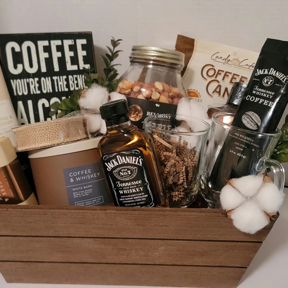 Coffee and Whiskey 3-wick candle, Coffee and Whiskey scented body wash, lotion and bar soap, Maple Bourbon Whiskey Peanuts, Jack Daniels Ground Coffee, Jack Daniels Whiskey, 2 Coffee Cups, Coffee flavored candy, Sign that reads " Coffee, you are on the bench, Alcohol, suit up", re-usable wooden box.