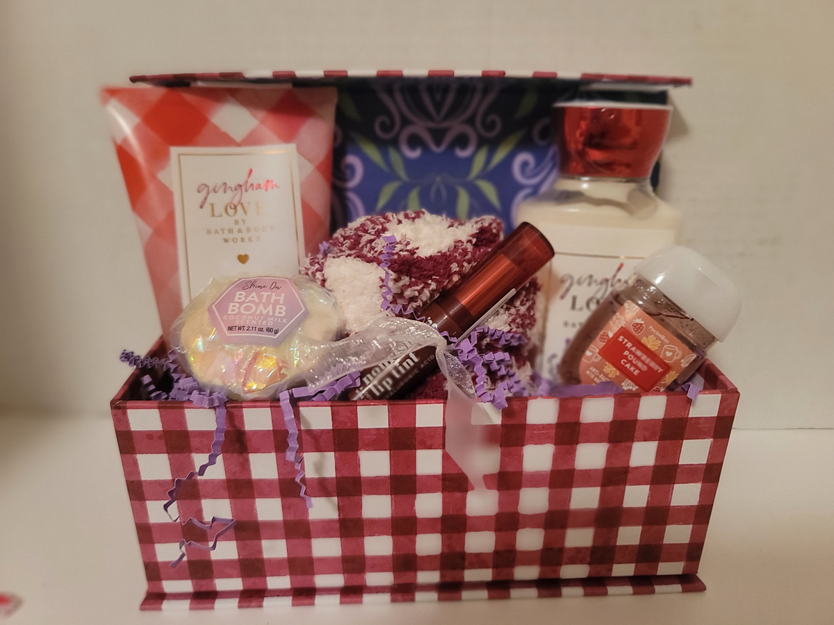 Ginham Love scented body sugar scrub, body lotion, lip tint, bath bomb, gingham socks, hand sanitizer, delicate reusable gingham box
