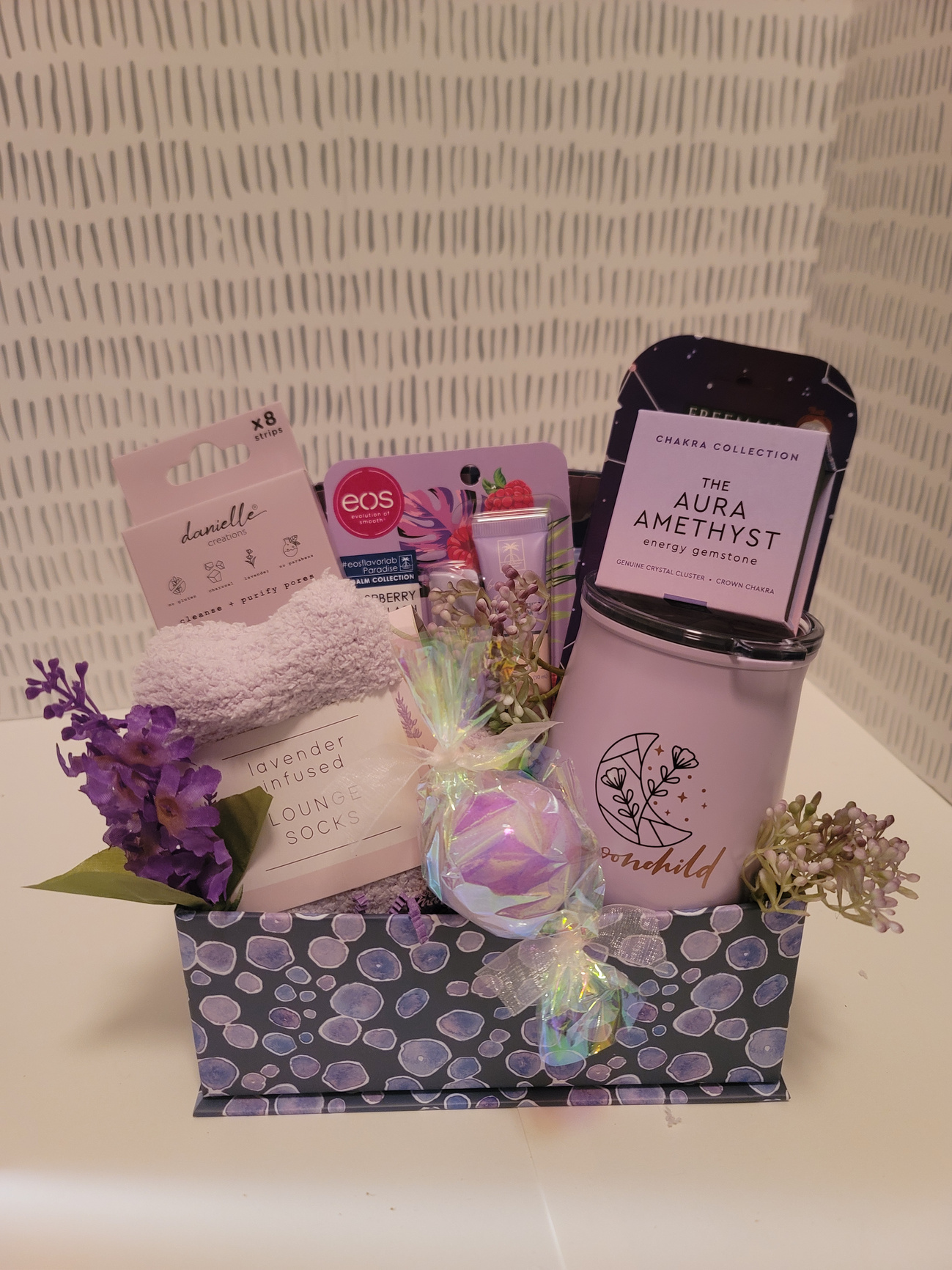 Wine tumbler, bath bombs, face masks, lavender pore strips, lavendar infused socks, amethyst stone and resusable lavender box.