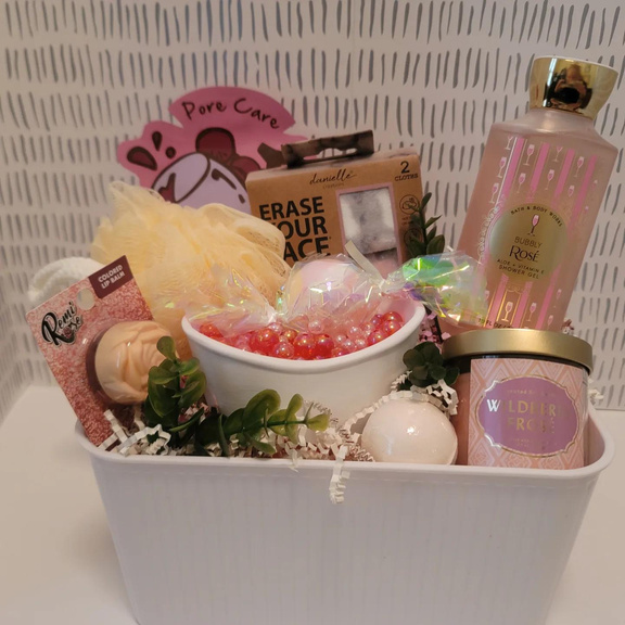 Bubbly Rose Body Wash, Willder Rose candle, Vanilla Coconut Bath Bombs, Bathtub Dish, Makeup cleansing cloths, Lip Balm, Buff scrubber, Face Mask